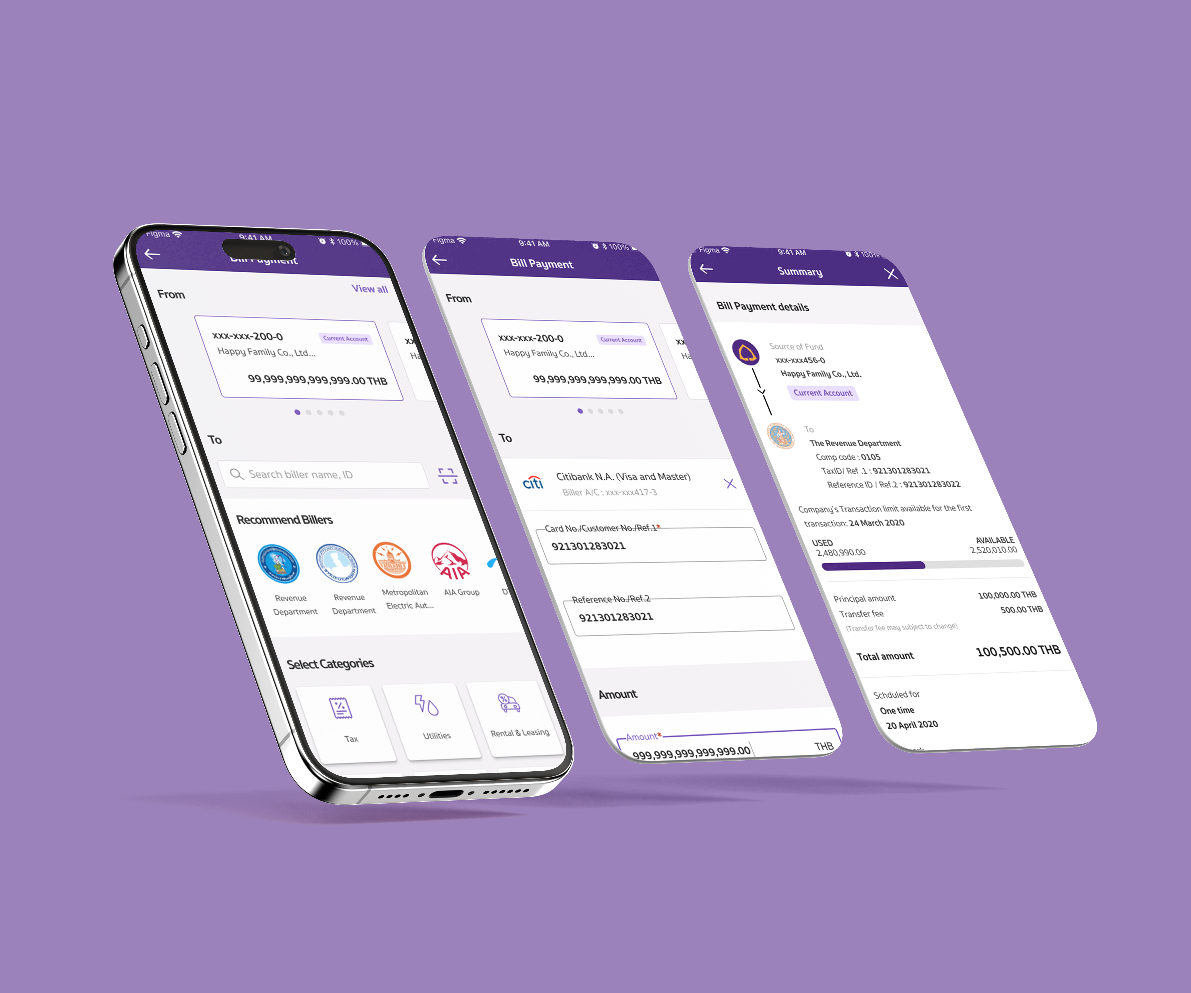 The application offers a wide range of features similar to SCB Easy, including bill payment and other essential financial services. Our design approach aimed to align with the retail application while introducing additional validation steps to ensure a seamless and secure user experience for corporate users.